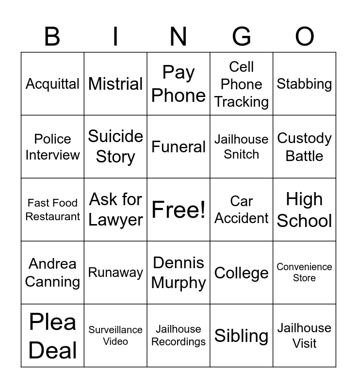 This bingo card has a free space and 54 words: Lester Holt, Andrea Canning, Keith Morrison, Josh Mankiewicz, Dennis Murphy, Life Insurance, Cell Phone Tracking, Tolls Tracking, Police Interview, Asks for a Lawyer, Acquittal, Security Video, Surveillance Video, Plea Deal, Phone Recordings, Jailhouse Recordings, Jailhouse Visit, Jailhouse Snitch, DNA Test, High School, College, Workplace Crime, Car Accident, Stabbing, Gunshot, Mistrial, Hung Jury, Mom, Dad, Sibling, Stepparent, Aunt, Best Friend, Uncle, Pay Phone, Local Reporter, Fast Food Restaurant, Convenience Store, Strangled, Suicide Story, Fire/Arson, Out of Character, Missing Video, Cold Case, Runaway, Kidnapping, Prom, Wedding, Funeral, Ask for Lawyer, Custody Battle, Antifreeze, Poison and Defendant take Stand.