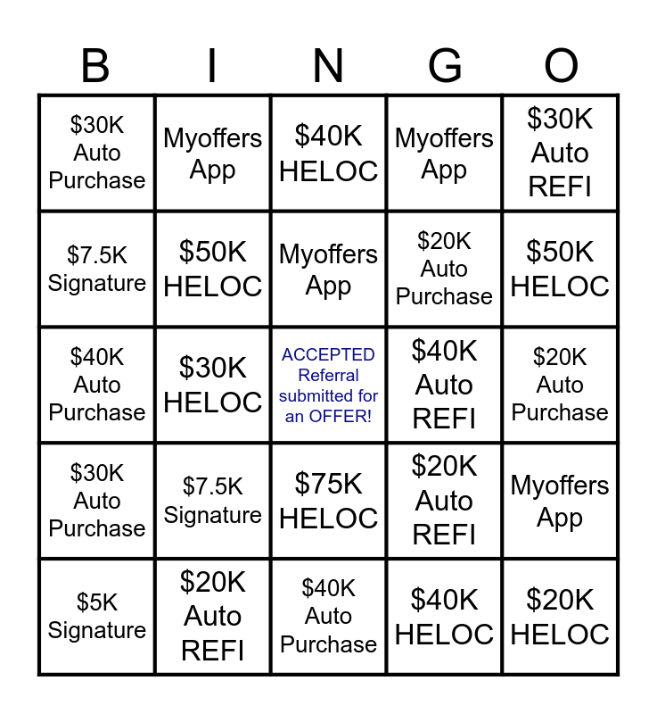 This bingo card has a free space and 29 words: $5K Signature, $100K HELOC, $30K HELOC, $50K Auto Purchase, $30K Auto Purchase, $40K HELOC, $50K HELOC, $7.5K Signature, $40K Auto REFI, $20K Auto REFI, $20K Auto Purchase, $20K HELOC, $40K Auto Purchase, $40K HELOC, $50K HELOC, $10K Signature, $75K HELOC, $30K Auto Purchase, $30K Auto REFI, $40K Auto Purchase, $20K Auto REFI, $20K HELOC, $20K Auto Purchase, $7.5K Signature, Myoffers App, Myoffers App, Myoffers App, Myoffers App and Myoffers App.
