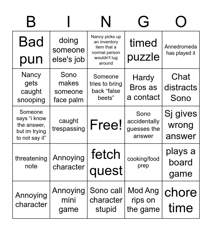 This bingo card has a free space and 81 words: Someone in chat compliments Sonos hair, Ang saves chat from Sonos singing, Nancy picks up an inventory item that a normal person wouldn't lug around, Easter egg that references another game, Phone a friend, Secret code, Nancy has to repair something using an implausible inventory item, Nancy steals, Someone awkwardly flirts with Nancy, Sono dies, First try, Game crashes, timed puzzle, Bad pun, Someone does a bad accent, Nancy gets caught snooping, Snack time, Annoying character, Sj tells a pun, Sj gives wrong answer, Chat gets the answer wrong, Annedromeda has played it, Someone says “i know the answer, but im trying to not say it”, Someone tries to bring back “false beets”, Sono makes someone face palm, Sono gets stuck on puzzle for 20 mins +, Sono is mean to the mods, Sono overthinks puzzle, Sono writes something down, Sono forgets, Chat distracts Sono, Sono threatens character, Sono call character stupid, Sono argues with nancy, Annoying character, Sono accidentally guesses the answer, Sono blames chat, Sono takes all the credit, secret tunnel, doing someone else's job, chore time, guy is yuck, calls Nancy the wrong name, going through Nancy's luggage, caught trespassing, villain speech, doing someone else's job, doing someone else's chore, supposed to be on vacation, Nancy actually hired to solve mystery, cooking/food prep, plays a board game, hello goodbye convo, peephole, "It's locked", Nancy is cynic, life or death situation, Nancy gets knocked out, Nancy is sassy, photorealistic picture, fetch quest, care for an animal, Secret code, Koko Kringle bar, new emote, talking down on Nancy's age, eavesdropping, dangerous animal, disguise/costume, tragic backstory, Someone is rude to nancy, threatening note, Annoying mini game, jump scare, old newspaper, secret compartment, OSHA violation, Mod Ang rips on the game, Sono gets lost, Hardy Bros as a contact and Bess/George as a contact.
