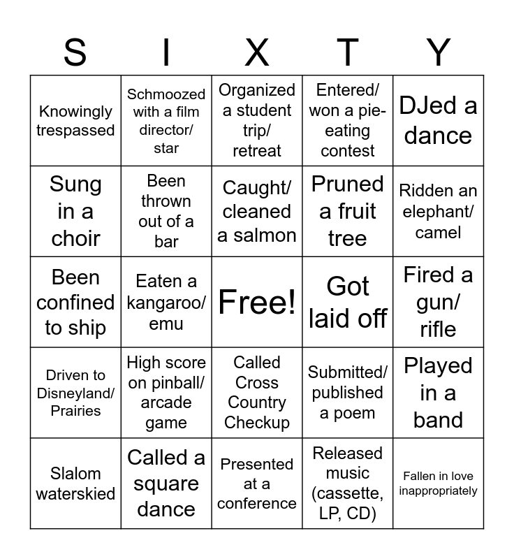 This bingo card has a free space and 41 words: Been best man/ woman, Been confined to ship, Been Mike’s neighbour, Been thrown out of a bar, Called a square dance, Called Cross Country Checkup, Caught/ cleaned a salmon, Climbed Black Tusk or similar, DJed a dance, Driven to Disneyland/ Prairies, Eaten a kangaroo/ emu, Entered/ won a pie-eating contest, Fallen in love inappropriately, Fired a gun/ rifle, Got laid off, High score on pinball/ arcade game, Hosted a radio show, Knowingly trespassed, Made a film/ video, Organized a student trip/ retreat, Played in a band, Played/ won chess competitively, Presented at a conference, Pruned a fruit tree, Published a paper, Raced/ won at a track meet, Released music (cassette, LP, CD), Reno’ed a kitchen, Ridden an elephant/ camel, Rock-climbed, Sailed around Salt Spring, Schmoozed with a film director/ star, Slalom waterskied, Snowboarded, Submitted/ published a poem, Sung in a choir, Swam with a dolphin, Travelled north of BC, Unintentionally had a child, Used a waffle iron and Written a computer program/ app.