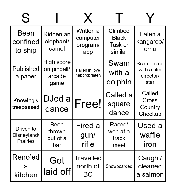 This bingo card has a free space and 41 words: Made a film/ video, Knowingly trespassed, Hosted a radio show, High score on pinball/ arcade game, Got laid off, Fired a gun/ rifle, Fallen in love inappropriately, Entered/ won a pie-eating contest, Eaten a kangaroo/ emu, Driven to Disneyland/ Prairies, DJed a dance, Climbed Black Tusk or similar, Caught/ cleaned a salmon, Called Cross Country Checkup, Called a square dance, Been thrown out of a bar, Been Mike’s neighbour, Been confined to ship, Been best man/ woman, Written a computer program/ app, Used a waffle iron, Unintentionally had a child, Travelled north of BC, Swam with a dolphin, Sung in a choir, Submitted/ published a poem, Snowboarded, Slalom waterskied, Schmoozed with a film director/ star, Sailed around Salt Spring, Rock-climbed, Ridden an elephant/ camel, Reno’ed a kitchen, Released music (cassette, LP, CD), Raced/ won at a track meet, Published a paper, Pruned a fruit tree, Presented at a conference, Played/ won chess competitively, Played in a band and Organized a student trip/ retreat.