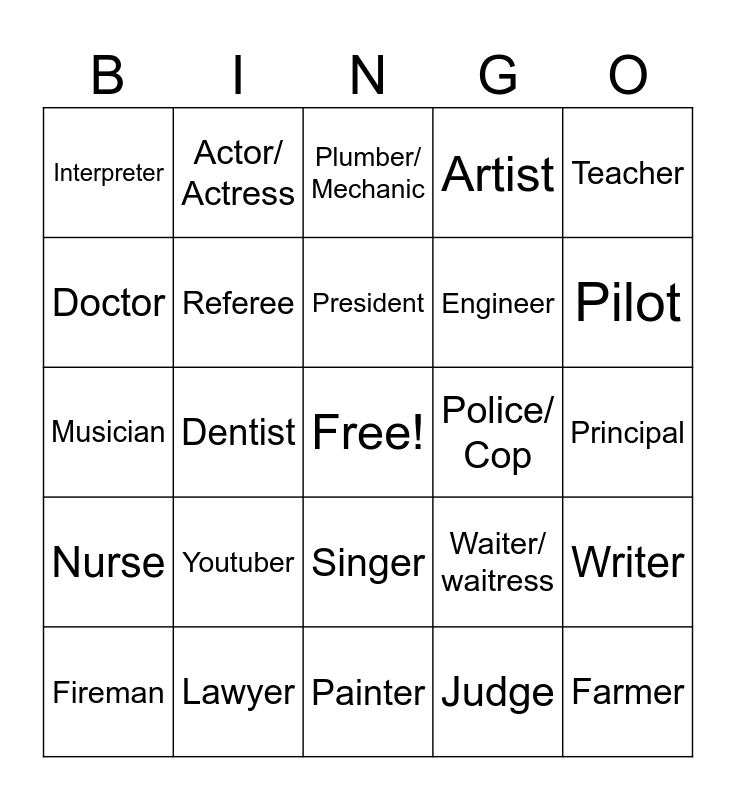 This bingo card has a free space and 24 words: Youtuber, Lawyer, President, Fireman, Teacher, Interpreter, Doctor, Actor/ Actress, Police/ Cop, Singer, Engineer, Musician, Waiter/ waitress, Writer, Referee, Judge, Principal, Plumber/ Mechanic, Pilot, Dentist, Farmer, Nurse, Artist and Painter.