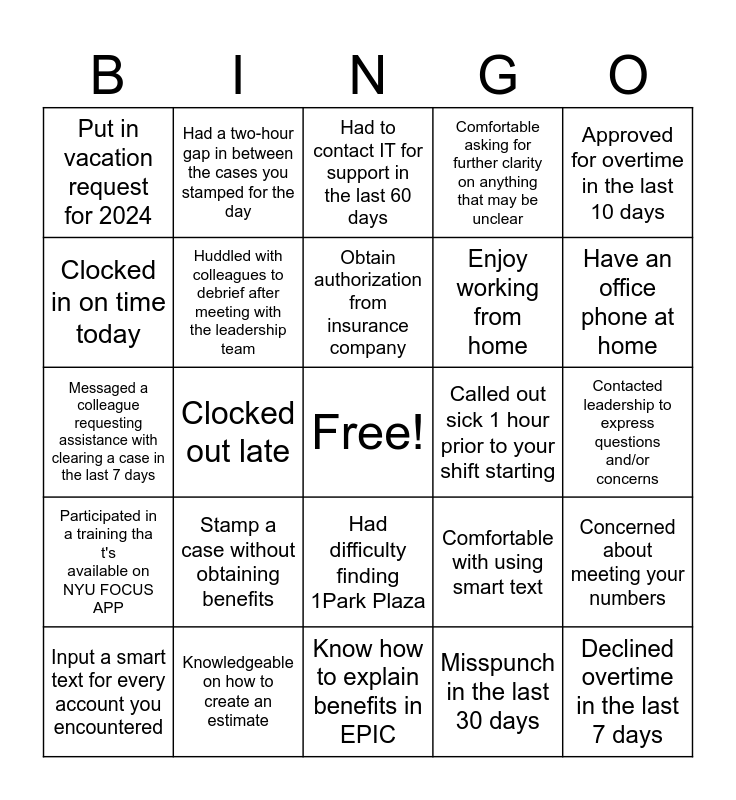 This bingo card has a free space and 24 words: Input a smart text for every account you encountered, Stamp a case without obtaining benefits, Obtain authorization from insurance company, Misspunch in the last 30 days, Approved for overtime in the last 10 days, Put in vacation request for 2024, Had a two-hour gap in between the cases you stamped for the day, Had to contact IT for support in the last 60 days, Called out sick 1 hour prior to your shift starting, Contacted leadership to express questions and/or concerns, Messaged a colleague requesting assistance with clearing a case in the last 7 days, Huddled with colleagues to debrief after meeting with the leadership team, Comfortable with using smart text, Concerned about meeting your numbers, Clocked in on time today, Knowledgeable on how to create an estimate, Know how to explain benefits in EPIC, Comfortable asking for further clarity on anything that may be unclear, Have an office phone at home, Participated in a training that's available on NYU FOCUS APP, Clocked out late, Had difficulty finding 1Park Plaza, Enjoy working from home and Declined overtime in the last 7 days.