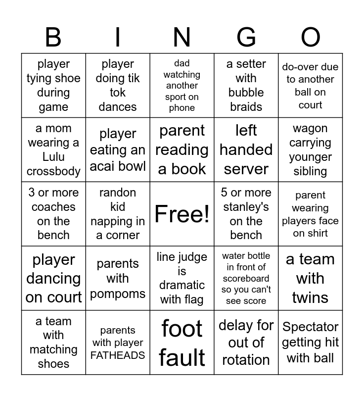 This bingo card has a free space and 32 words: delay for out of rotation, score is incorrect, randon kid napping in a corner, sibling on ipad, player dancing on court, player eating an acai bowl, do-over due to another ball on court, a team with twins, player doing tik tok dances, tripod knocked over by a stray ball, parent reading a book, dad watching another sport on phone, the bed thing you spin around to add air, parent wearing tshirt for a sport other than volleyball, 5 or more stanley's on the bench, sleeveless jerseys with added sleeves, a team with matching shoes, 3 or more coaches on the bench, line judge is dramatic with flag, parents with pompoms, water bottle in front of scoreboard so you can't see score, yellow card, parent wearing players face on shirt, parents with player FATHEADS, Spectator getting hit with ball, a setter with bubble braids, left handed server, a mom wearing a Lulu crossbody, player tying shoe during game, foot fault, a player drinking a Celcius and wagon carrying younger sibling.