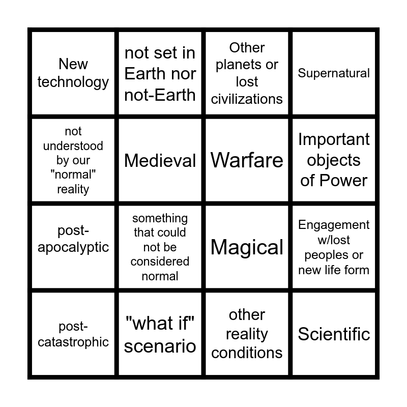This bingo card has 16 words: "what if" scenario, Engagement w/lost peoples or new life form, Other planets or lost civilizations, New technology, post-apocalyptic, not set in Earth nor not-Earth, Magical, other reality conditions, not understood by our "normal" reality, Medieval, post-catastrophic, Supernatural, something that could not be considered normal, Important objects of Power, Warfare and Scientific.