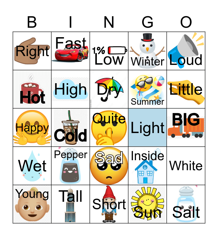 This bingo card has 30 images and 34 words: Salt, Sun, Dark, Outside, Wet, High, Loud, Young, Fast, Old, Dry, Low, Left, Moon, Light, Little, Tall, Happy, Pepper, Inside, Sad, Slow, Right, BIG, Short, Quite, Winter, Black, Summer, Hot, Awake, Cold, White and Sleeping.