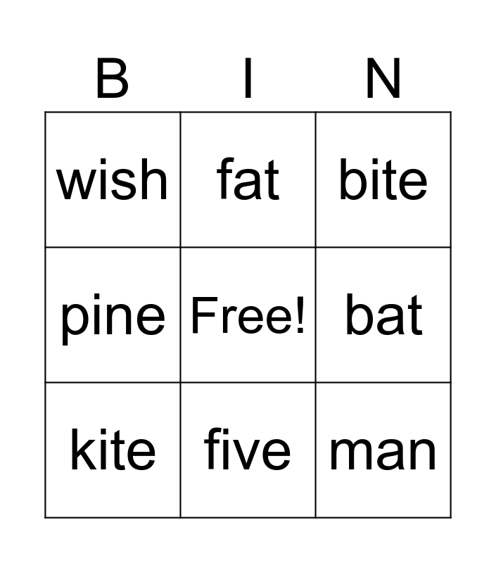 This bingo card has a free space and 14 words: ship, lake, kite, fat, pine, man, pin, mane, five, wish, dig, bat, bite and mate.