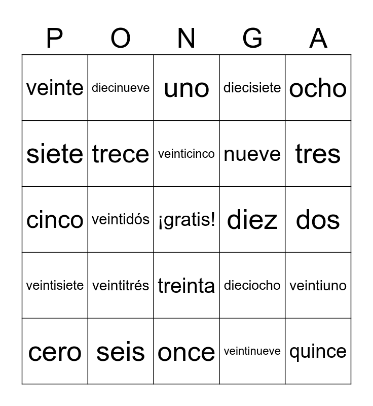 This bingo card has a free space and 29 words: cero, doce, veintidós, cuatro, veinte, uno, trece, veintitrés, diez, seis, dos, quince, once, veintinueve, tres, dieciséis, treinta, veintisiete, ocho, cinco, dieciocho, catorce, nueve, siete, diecisiete, diecinueve, veintiuno, veinticinco and veintiséis.
