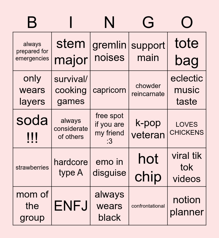 This bingo card has a free space and 24 words: hardcore type A, ENFJ, capricorn, mom of the group, tote bag, always prepared for emergencies, only wears layers, stem major, k-pop veteran, emo in disguise, chowder reincarnate, soda !!!, hot chip, viral tik tok videos, survival/ cooking games, confrontational, LOVES CHICKENS, gremlin noises, eclectic music taste, always considerate of others, notion planner, strawberries, support main and always wears black.