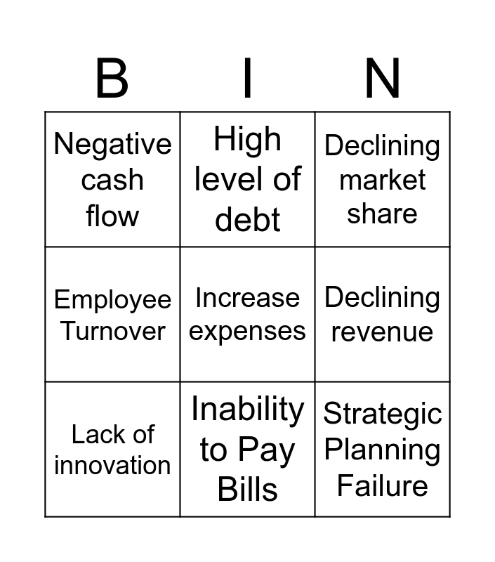 This bingo card has a free space and 8 words: Declining revenue, Declining market share, High level of debt, Lack of innovation, Negative cash flow, Strategic Planning Failure, Employee Turnover and Inability to Pay Bills.