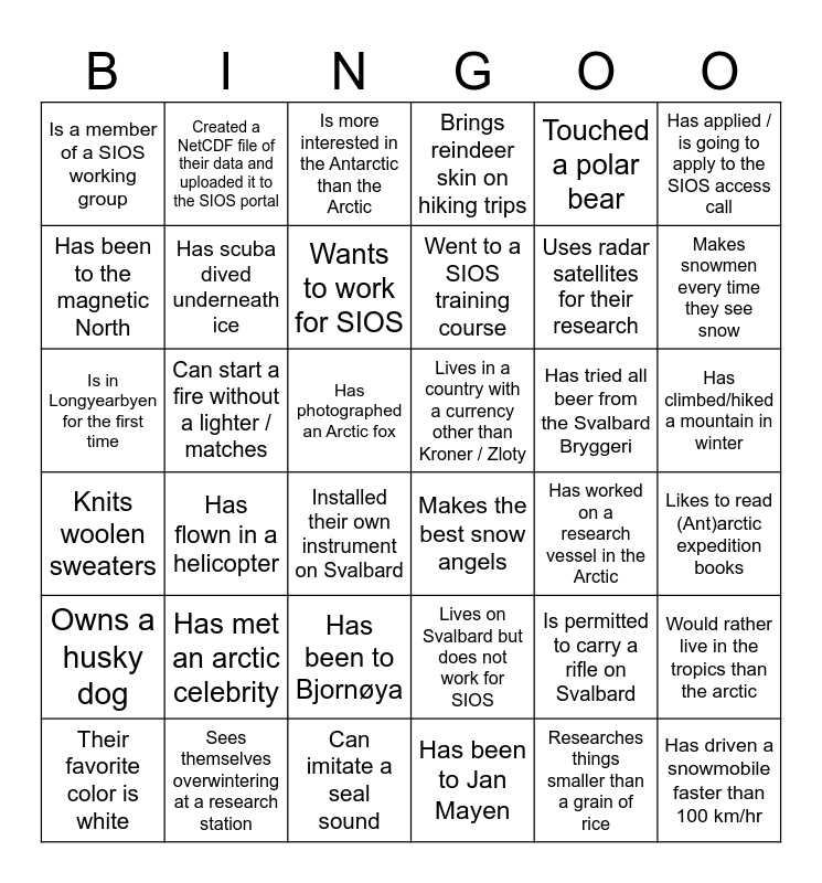 This bingo card has 36 words: Lives on Svalbard but does not work for SIOS, Has been to Bjornøya, Has been to Jan Mayen, Has been to the magnetic North, Knits woolen sweaters, Lives in a country with a currency other than Kroner / Zloty, Has scuba dived underneath ice, Can imitate a seal sound, Touched a polar bear, Is permitted to carry a rifle on Svalbard, Makes snowmen every time they see snow, Brings reindeer skin on hiking trips, Would rather live in the tropics than the arctic, Can start a fire without a lighter / matches, Went to a SIOS training course, Is a member of a SIOS working group, Owns a husky dog, Has tried all beer from the Svalbard Bryggeri, Is in Longyearbyen for the first time, Is more interested in the Antarctic than the Arctic, Has photographed an Arctic fox, Has flown in a helicopter, Makes the best snow angels, Installed their own instrument on Svalbard, Has worked on a research vessel in the Arctic, Created a NetCDF file of their data and uploaded it to the SIOS portal, Uses radar satellites for their research, Sees themselves overwintering at a research station, Wants to work for SIOS, Has applied / is going to apply to the SIOS access call, Has driven a snowmobile faster than 100 km/hr, Their favorite color is white, Likes to read (Ant)arctic expedition books, Has climbed/hiked a mountain in winter, Has met an arctic celebrity and Researches things smaller than a grain of rice.
