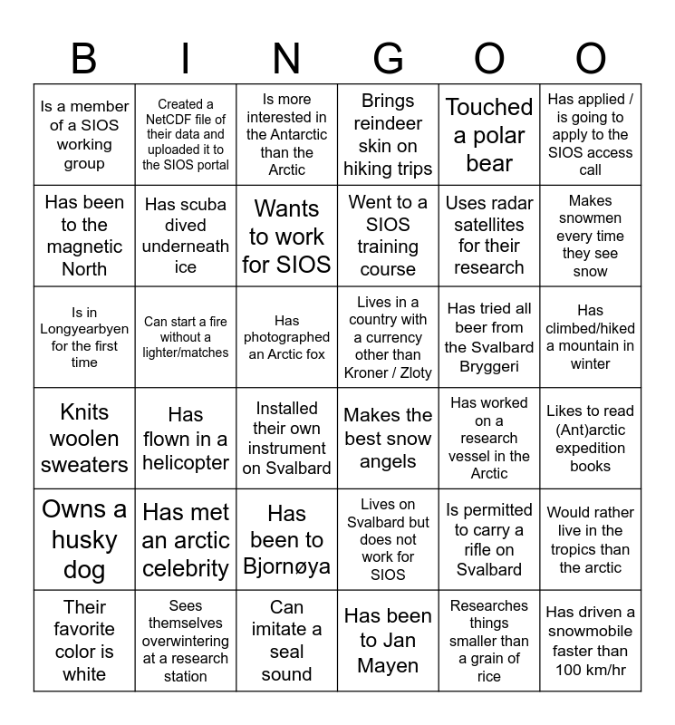 This bingo card has 36 words: Lives on Svalbard but does not work for SIOS, Has been to Bjornøya, Has been to Jan Mayen, Has been to the magnetic North, Knits woolen sweaters, Lives in a country with a currency other than Kroner / Zloty, Has scuba dived underneath ice, Can imitate a seal sound, Touched a polar bear, Is permitted to carry a rifle on Svalbard, Makes snowmen every time they see snow, Brings reindeer skin on hiking trips, Would rather live in the tropics than the arctic, Can start a fire without a lighter/matches, Went to a SIOS training course, Is a member of a SIOS working group, Owns a husky dog, Has tried all beer from the Svalbard Bryggeri, Is in Longyearbyen for the first time, Is more interested in the Antarctic than the Arctic, Has photographed an Arctic fox, Has flown in a helicopter, Makes the best snow angels, Installed their own instrument on Svalbard, Has worked on a research vessel in the Arctic, Created a NetCDF file of their data and uploaded it to the SIOS portal, Uses radar satellites for their research, Sees themselves overwintering at a research station, Wants to work for SIOS, Has applied / is going to apply to the SIOS access call, Has driven a snowmobile faster than 100 km/hr, Their favorite color is white, Likes to read (Ant)arctic expedition books, Has climbed/hiked a mountain in winter, Has met an arctic celebrity and Researches things smaller than a grain of rice.