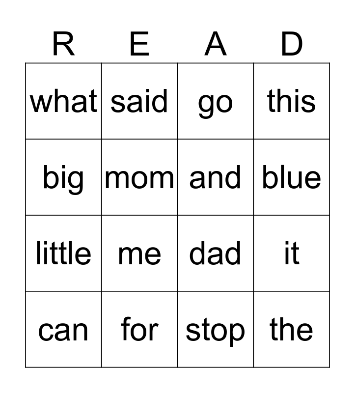 This bingo card has a free space and 15 words: can, the, go, what, blue, big, me, stop, mom, little, it, this, and, said and for.