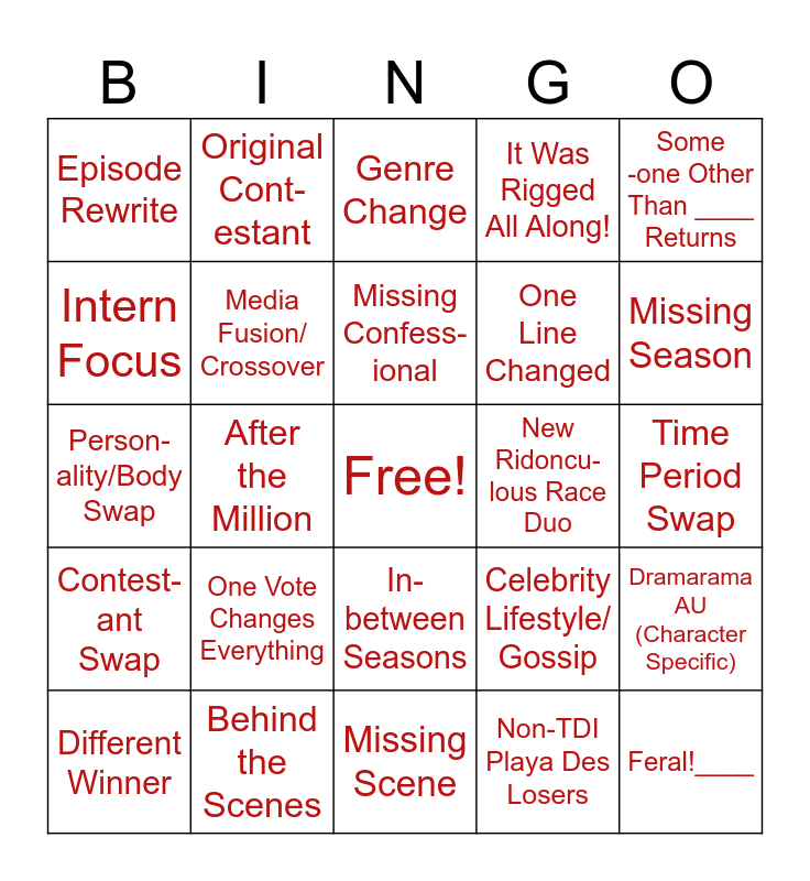 This bingo card has a free space and 24 words: Different Winner, One Vote Changes Everything, Missing Confess-ional, Non-TDI Playa Des Losers, Some -one Other Than ____ Returns, Episode Rewrite, Original Cont- estant, Genre Change, New Ridoncu- lous Race Duo, Time Period Swap, Person- ality/Body Swap, Media Fusion/ Crossover, Celebrity Lifestyle/ Gossip, Dramarama AU (Character Specific), Intern Focus, Behind the Scenes, Missing Scene, It Was Rigged All Along!, Missing Season, Contest- ant Swap, After the Million, In-between Seasons, One Line Changed and Feral!____.