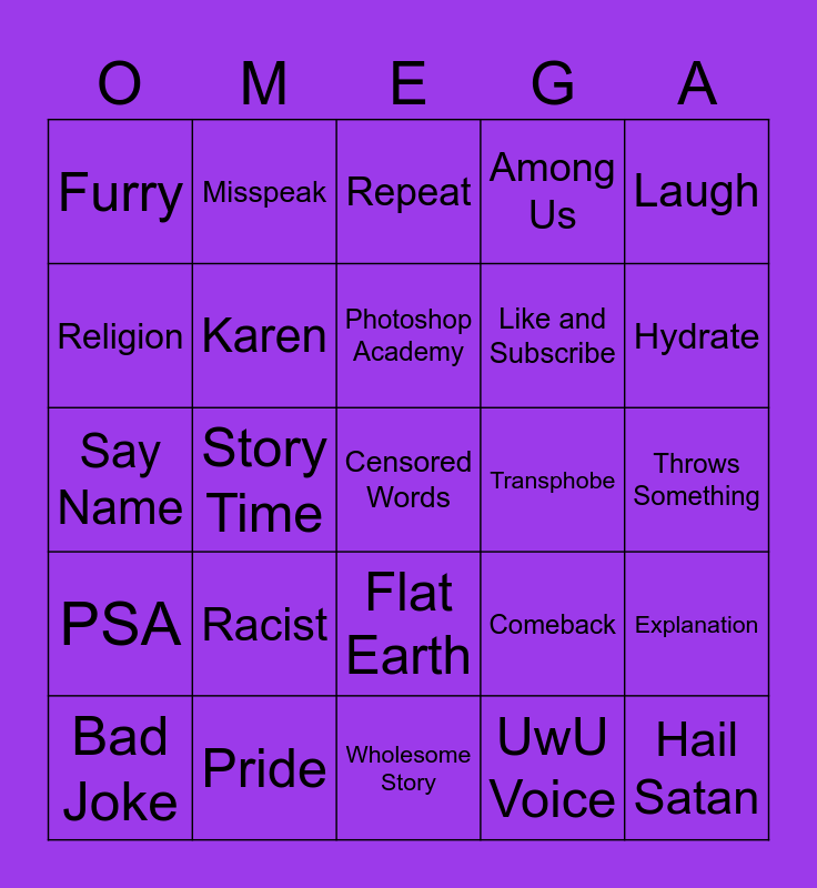 This bingo card has 29 words: Bad Joke, Plushy Promo, Story Time, Hail Satan, Furry, Repeat, Karen, Racist, Transphobe, Pride, Throws Something, Censored Words, Wholesome Story, UwU Voice, Hydrate, Anti Vax, Flat Earth, PSA, Laugh, Say Name, Comeback, Insult, Like and Subscribe, Religion, Among Us, Misspeak, Explanation, Photoshop Academy and Unintentionally Lewd.