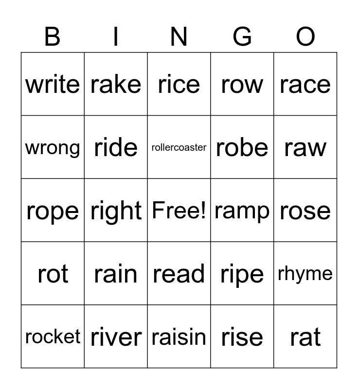 This bingo card has a free space and 24 words: rain, river, rollercoaster, rocket, race, write, wrong, rake, ramp, read, robe, rope, ripe, rhyme, ride, rise, rose, rice, raw, right, rat, rot, row and raisin.