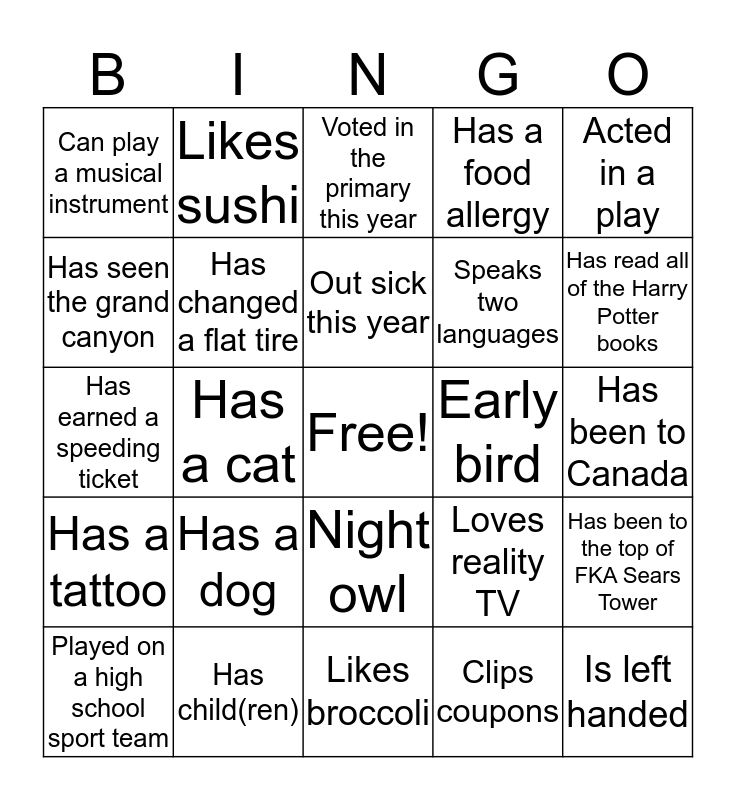 This bingo card has a free space and 24 words: Has a dog, Has child(ren), Out sick this year, Played on a high school sport team, Acted in a play, Can play a musical instrument, Has seen the grand canyon, Likes sushi, Early bird, Night owl, Speaks two languages, Has earned a speeding ticket, Loves reality TV, Has been to the top of FKA Sears Tower, Has changed a flat tire, Clips coupons, Has been to Canada, Voted in the primary this year, Has read all of the Harry Potter books, Has a cat, Is left handed, Has a tattoo, Has a food allergy and Likes broccoli.