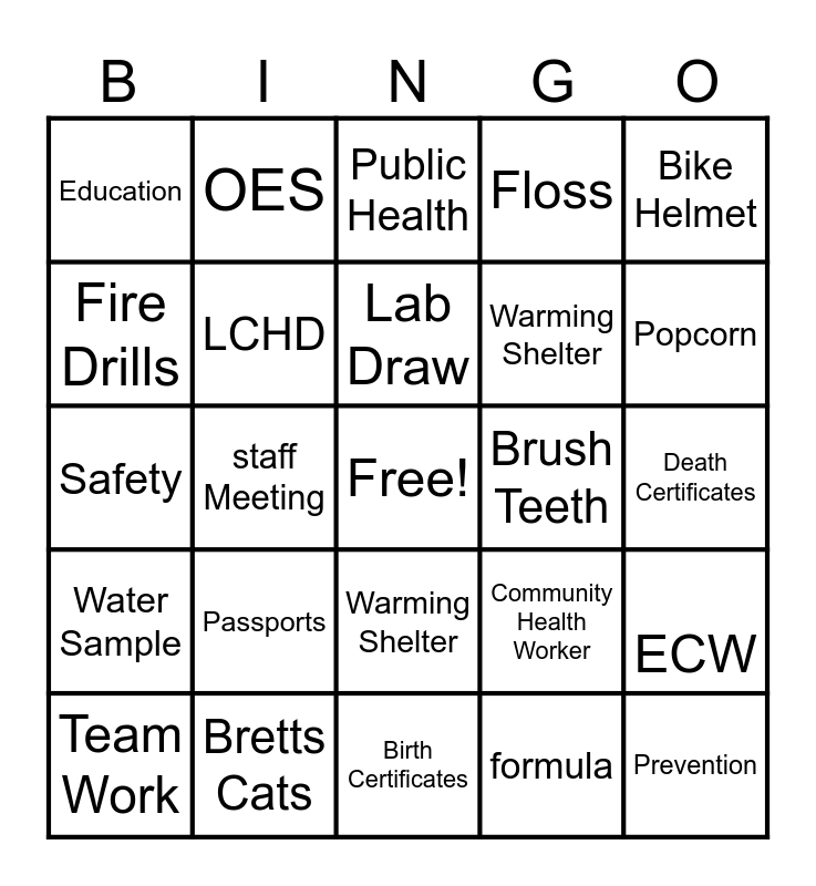 This bingo card has a free space and 34 words: car seats, formula, WIC, Cavity, Water Sample, LCHD, Bike Helmet, Team Work, OES, Formula, Lab Draw, Public Health, Animal Bites, Lincoln County, Brush Teeth, Popcorn, Bretts Cats, Safety, Passports, Community Health Worker, Warming Shelter, Vaccination, Education, Death Certificates, Birth Certificates, Prevention, Floss, Hand Washing, Warming Shelter, Fire Drills, Nursing, staff Meeting, ECW and Travel vaccines.