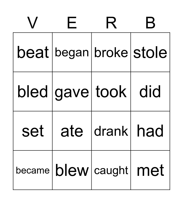 This bingo card has 20 words: had, held, broke, bet, became, bled, blew, beat, set, began, ate, drank, gave, met, took, was, did, stole, caught and were.