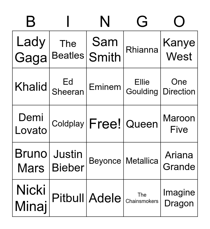 This bingo card has a free space and 37 words: Drake, Taylor Swift, The Weeknd, Ed Sheeran, Ariana Grande, Justin Bieber, Eminem, Post Malone, Kanye West, Billie Eilish, Coldplay, Rhianna, Imagine Dragon, Maroon Five, Khalid, Bruno Mars, Kendrick Lamar, Sam Smith, Beyonce, Queen, Lady Gaga, One Direction, Nicki Minaj, Adele, Shakira, The Chainsmokers, The Beatles, Linkedin, Katie Perry, Miley Cyrus, Michael Jackson, Pitbull, Demi Lovato, Elton John, Metallica, Ellie Goulding and Lil Nas X.