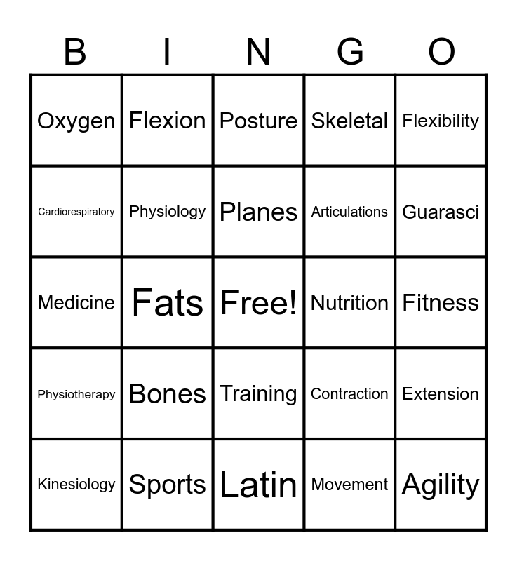 This bingo card has a free space and 29 words: Kinesiology, Muscles, Fats, Proteins, Oxygen, Posture, Physiology, Bones, Nutrition, Sports, Fitness, Agility, Latin, Movement, Guarasci, Joints, Training, Physiotherapy, Flexibility, Medicine, Contraction, Movement, Articulations, Cardiorespiratory, Skeletal, Flexion, Extension, Planes and Axis.