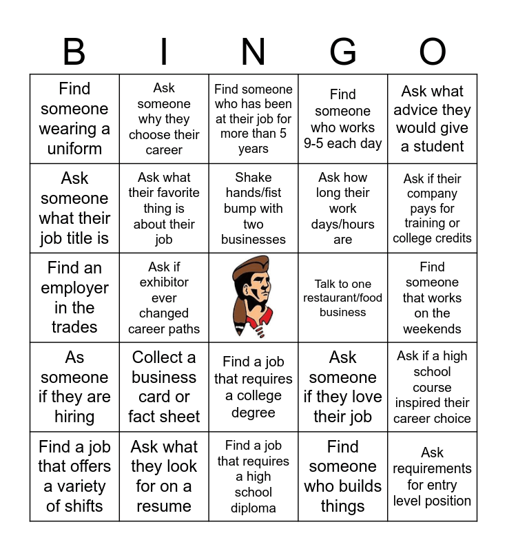This bingo card has a free space and 25 words: Collect a business card or fact sheet, Find a job that requires a high school diploma, Shake hands/fist bump with two businesses, Find a job that offers a variety of shifts, Ask what advice they would give a student, Find someone wearing a uniform, Ask someone what their job title is, Ask someone why they choose their career, Talk to one restaurant/food business, Find a job that requires a college degree, Ask how long their work days/hours are, Find an employer in the trades, Ask someone if they love their job, Ask if a high school course inspired their career choice, Ask what their favorite thing is about their job, Find someone who travels for their job, Find someone that works on the weekends, Find someone who has been at their job for more than 5 years, Ask if their company pays for training or college credits, Ask if exhibitor ever changed career paths, Ask requirements for entry level position, Ask what they look for on a resume, As someone if they are hiring, Find someone who works 9-5 each day and Find someone who builds things.