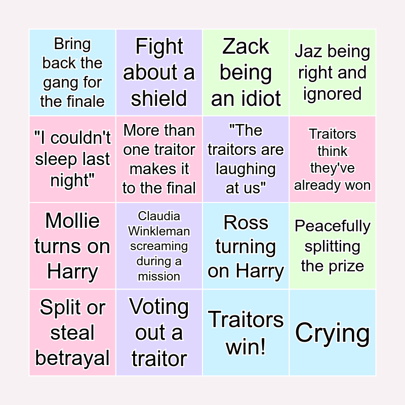 This bingo card has 28 words: Harry big brain moment, Evil licking lips (yuck), Mollie turns on Harry, Losing a load of money due to incompetence, More than one traitor makes it to the final, Zack being an idiot, Fight about a shield, Crying, Voting out a traitor, Andrew or Ross being backstabbed, Ross turning on Harry, Jaz being right and ignored, Ross revealing Diane is his mum, Andrew shocked Pikachu, Claudia Winkleman screaming during a mission, Voting out a faithful, Dramatic murder, "The traitors are laughing at us", Traitors think they've already won, Dramatic hood scene, Bring back the gang for the finale, PLOT TWIST!, Split or steal betrayal, Peacefully splitting the prize, Traitors win!, Faithful win!, "I couldn't sleep last night" and Ominous music and castle shot.