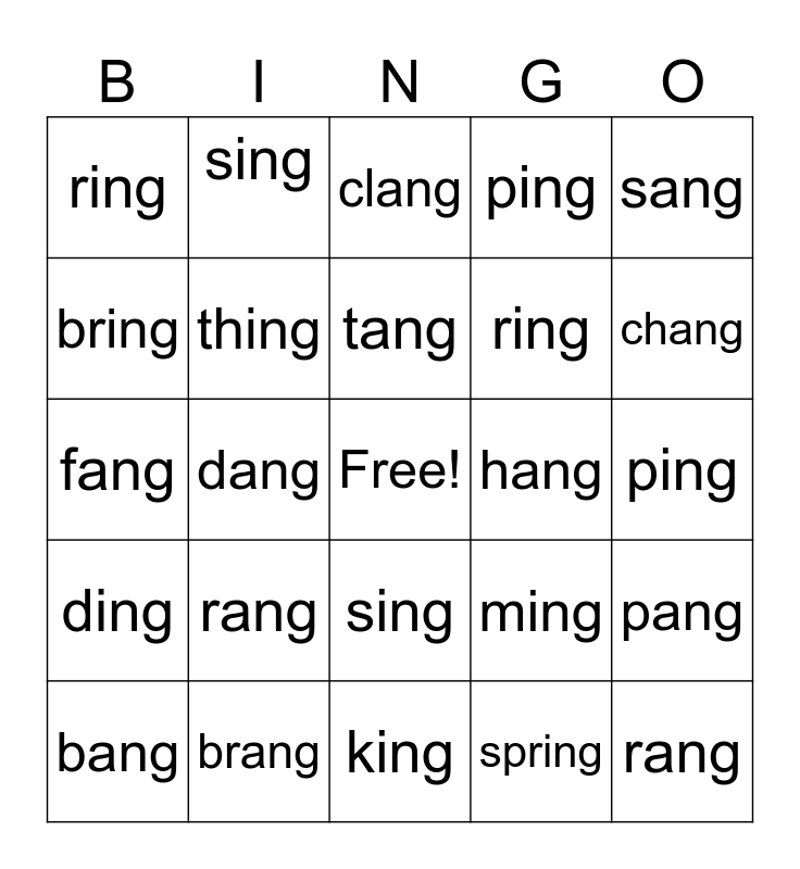 This bingo card has a free space and 24 words: bang, rang, tang, spring, sang, ring, sing, clang, hang, ping, fang, thing, ming, pang, bring, brang, king, ping, chang, ding, dang, sing, ring and rang.