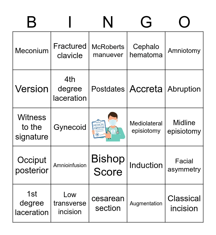 This bingo card has a free space and 24 words: Amnioinfusion, Low transverse incision, Postdates, 1st degree laceration, Amniotomy, Meconium, Version, Fractured clavicle, Mediolateral episiotomy, Bishop Score, Accreta, Witness to the signature, Induction, Facial asymmetry, 4th degree laceration, Augmentation, Midline episiotomy, McRoberts manuever, Abruption, Gynecoid, Classical incision, Occiput posterior, Cephalo hematoma and cesarean section.