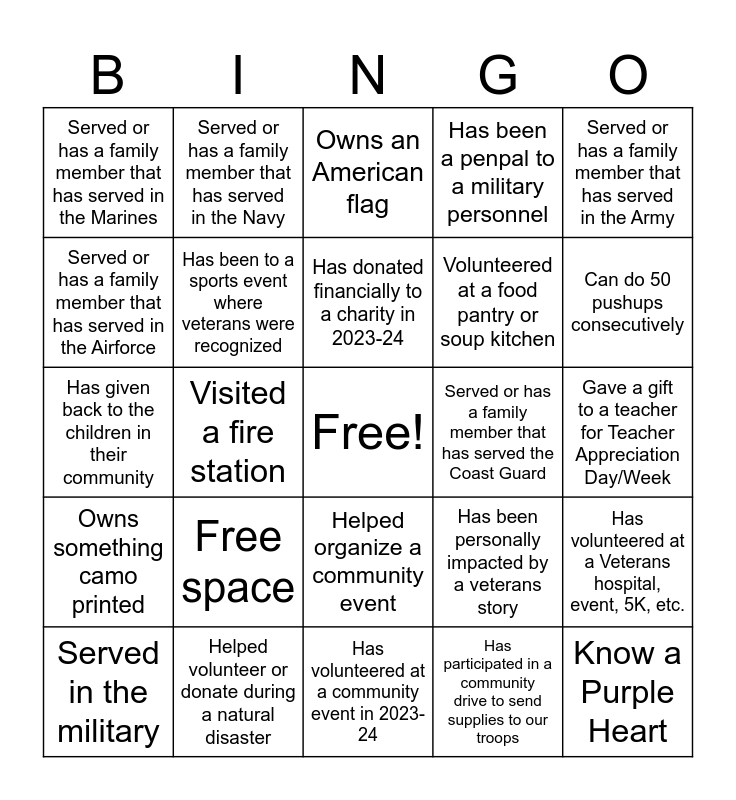 This bingo card has a free space and 25 words: Free space, Has volunteered at a community event in 2023-24, Has donated financially to a charity in 2023-24, Served in the military, Served or has a family member that has served in the Army, Served or has a family member that has served in the Marines, Served or has a family member that has served in the Airforce, Served or has a family member that has served in the Navy, Served or has a family member that has served the Coast Guard, Helped organize a community event, Volunteered at a food pantry or soup kitchen, Has given back to the children in their community, Has been personally impacted by a veterans story, Has volunteered at a Veterans hospital, event, 5K, etc., Has been to a sports event where veterans were recognized, Adopted a pet, Gave a gift to a teacher for Teacher Appreciation Day/Week, Owns an American flag, Can do 50 pushups consecutively, Visited a fire station, Know a Purple Heart, Helped volunteer or donate during a natural disaster, Owns something camo printed, Has been a penpal to a military personnel and Has participated in a community drive to send supplies to our troops.