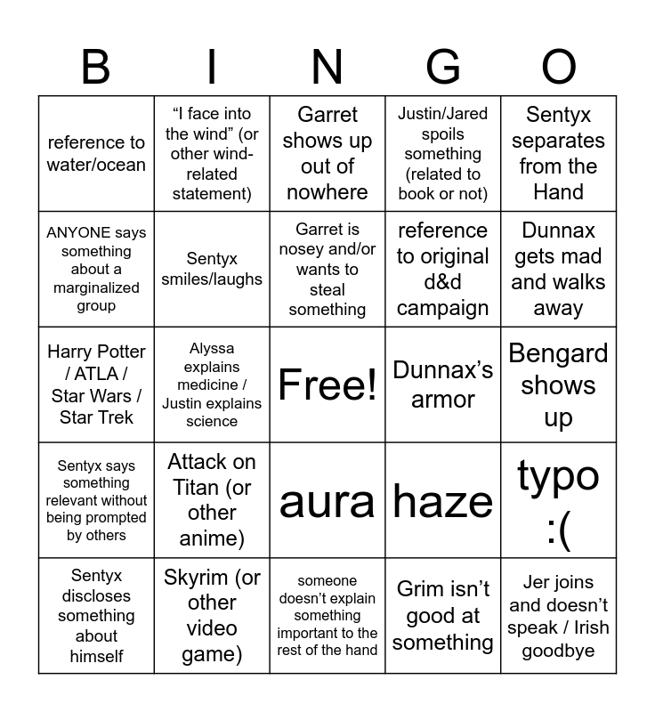 This bingo card has a free space and 34 words: Grim’s ominous one-liner, Grim isn’t good at something, Grim falls down, Sentyx doesn’t respond to someone talking directly to him, Sentyx says something relevant without being prompted by others, Sentyx smiles/laughs, Sentyx separates from the Hand, Sentyx discloses something about himself, “I face into the wind” (or other wind-related statement), Ulken can’t be trusted, Garret is nosey and/or wants to steal something, Garret shows up out of nowhere, Inac doesn’t know something, Inac is disappointed, Dunnax’s armor, Dunnax gets mad and walks away, Skyrim (or other video game), Harry Potter / ATLA / Star Wars / Star Trek, Attack on Titan (or other anime), haze, aura, “remember what’s real” (said or implied by a character), reference to water/ocean, Bengard shows up, someone doesn’t explain something important to the rest of the hand, Jer joins and doesn’t speak / Irish goodbye, Justin/Jared spoils something (related to book or not), Justin/Jared wants to say something but isn’t sure if it’s a spoiler, reference to original d&d campaign, ANYONE says something about a marginalized group, Josh says we’ll find out in Book 2 / reference to newsletter, Alyssa explains medicine / Justin explains science, typo :( and Josh spoils something (verbal or visual).