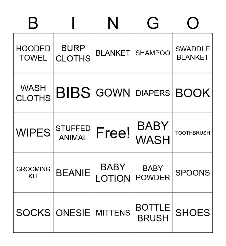 This bingo card has a free space and 25 words: BEANIE, MITTENS, GOWN, SOCKS, SWADDLE BLANKET, HOODED TOWEL, WASH CLOTHS, BURP CLOTHS, BABY WASH, BABY LOTION, DIAPERS, WIPES, BABY POWDER, SPOONS, BIBS, PACIFER, TOOTHBRUSH, BLANKET, BOOK, STUFFED ANIMAL, SHOES, ONESIE, GROOMING KIT, SHAMPOO and BOTTLE BRUSH.