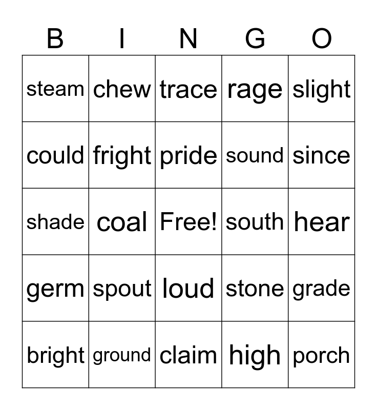 This bingo card has a free space and 24 words: spout, ground, pride, bright, slight, steam, could, chew, south, loud, sound, shade, stone, grade, fright, high, hear, trace, since, coal, porch, germ, rage and claim.
