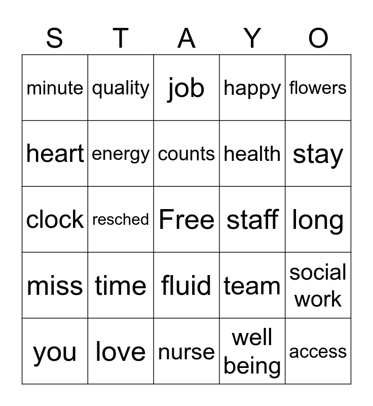 This bingo card has a free space and 24 words: time, love, counts, you, flowers, minute, heart, quality, staff, fluid, health, clock, team, social work, energy, well being, long, job, stay, resched, access, miss, happy and nurse.