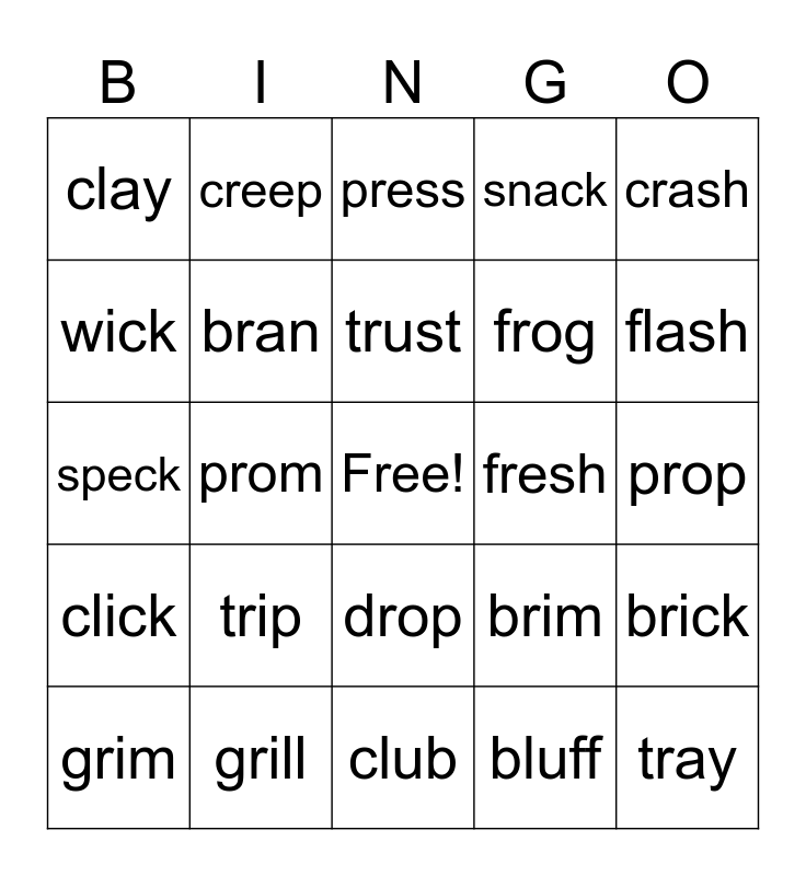 This bingo card has a free space and 24 words: trip, grill, trust, grim, crash, clay, wick, creep, fresh, drop, frog, speck, brim, brick, bran, bluff, prop, press, flash, prom, tray, click, snack and club.