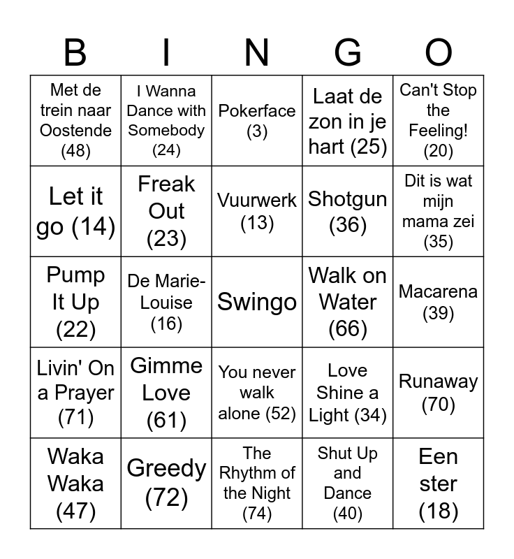 This bingo card has a free space and 75 words: Mooi, 't leven is mooi (1), Happier (2), Pokerface (3), De Kabouterdans (4), Louise (5), Sweet Caroline (6), Zeg eens meisje (7), Eye of the Tiger (8), De Pinguïndans (9), Dreams (10), Les Lacs du Connemara (11), Flowers (12), Vuurwerk (13), Let it go (14), Houdini (15), De Marie-Louise (16), Baby (17), Een ster (18), Born in the USA (19), Can't Stop the Feeling! (20), J'aime la vie (21), Pump It Up (22), Freak Out (23), I Wanna Dance with Somebody (24), Laat de zon in je hart (25), Daylight (26), Het Vliegerlied (27), Mambo nr.5 (28), Atemlos (29), Dos Cervesas (30), Tattoo (31), Wannabe (32), Happy (33), Love Shine a Light (34), Dit is wat mijn mama zei (35), Shotgun (36), Desire (37), Anton aus Tirol (38), Macarena (39), Shut Up and Dance (40), Lieve kleine piranha (41), Simply the best (42), I got a feeling (43), The Lazy Song (44), The Feeling (45), Barbie Girl (46), Waka Waka (47), Met de trein naar Oostende (48), Papaoutai (49), The Final Countdown (50), Erop of eronder (51), You never walk alone (52), Get Lucky (53), Kom wat dichterbij (54), Laat het gras maar groeien (55), Overdrive (56), YMCA (57), Allemaal (58), Don't stop me now (59), The way to your heart (60), Gimme Love (61), Ik wil je! (62), Dat Hadden Wij Moeten Zijn (63), Please don't stop the music (64), Girls Just Want to Have Fun (65), Walk on Water (66), Paradise City (67), Dancing Queen (68), Summer of 69 (69), Runaway (70), Livin' On a Prayer (71), Greedy (72), Sing Hallelujah (73), The Rhythm of the Night (74) and Het mooiste moment (75).