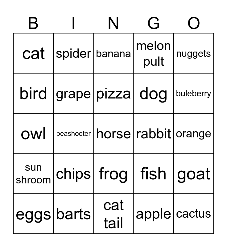 This bingo card has a free space and 24 words: chips, barts, pizza, eggs, nuggets, cat, bird, spider, rabbit, frog, dog, owl, fish, goat, grape, apple, orange, banana, buleberry, peashooter, cactus, sun shroom, melon pult and cat tail.