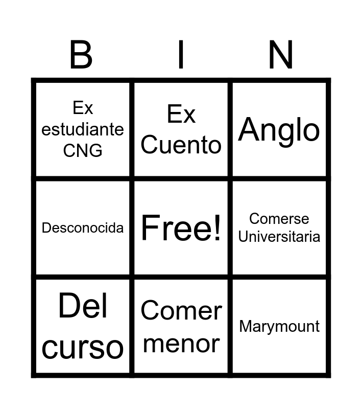 This bingo card has a free space and 8 words: Comerse Universitaria, Anglo, Ex Cuento, Del curso, Ex estudiante CNG, Marymount, Desconocida and Comer menor.