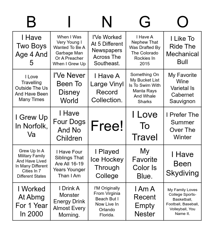 This bingo card has a free space and 126 words: 27 Years In The Mortgage Business, Alex Is My Life Coach, Although We Didnt Know Each Other, Brian Holland And I Lived In The Same Dorm Building Together During Freshman Year Of College, Ceedee Lamb Is My Jam, Country, Favorite Food: Pizza And Bagels, Grew Up In A Military Family And Have Lived In Many Different Cities In 7 Different States, I Am A Cowboys Fan, I Am A Recent Empty Nester, I Am Color Blind, I Am Expecting Two Grandbabies Exactly 4 Weeks Apart, I Am From Virginia Beach., I Am Married And Have An Eight Year Old Chocolate Lab., I Celebrated My 30Th Birthday By Running My First - And Last - Marathon., I Do Puzzles When I Need To Relax, It Helps Calm Me, I Dont Like Any Condiments., I Drink A Monster Energy Drink Almost Every Morning., I Enjoy Adventures Such As Parasailing And Ziplining., I Enjoy Axe Throwing., I Enjoy Relaxing With A Good Book And Spending Time With My Family., I Grew Up In Kansas City, Mo, I Grew Up In Norfolk, Va, I Had A Tornado Pass Through My Backyard In 2011, I Had Dinner With An Nfl Hall Of Famer, I Have 3 Boys, I Have A Large Vinyl Record Collection., I Have A Nephew That Was Drafted By The Colorado Rockies In 2015, I Have A Sister That Is 20 Years Younger, I Have A Twin, I Have Been Married For 20 Years., I Have Been Skydiving, I Have Been With Abmg 17 Years, I Have Four Dogs And No Children, I Have Four Siblings That Are All 16-19 Years Younger Than I Am, I Have Gone White Water Rafting., I Have Lived In 4 States, I Have Lived In One State My Whole Life., I Have Never Had A Broken Bone, I Have Ridden On A Camel In Egypt Next To The Pyramids., I Have Skydived., I Have Two Boys Age 4 And 5, I Have Two Grandchildren., I Have Two Kids., I Just Learned How To Ice Skate., I Just Started Skiing, I Learned How To Ski In Canada, I Like To Rehab Furniture, I Like To Ride The Mechanical Bull, I Live In North Carolina, I Love A Bar/Restaurant On The Water With A View, I Love A Good Roadtrip, I Love Both, But Will Take The Beach Over The Mountains, I Love British/Australian Mysteries, I Love Crime Documentaries, I Love Cruising, I Love Greek/Mediterranean Food, I Love Movies More Than Books, I Love Prosecco, I Love To Play Board Games, I Love To Travel, I Love Travelling Outside The Us And Have Been Many Times, I Managed A Bar A College, I Met A Super Model, I Once Had My Own Event Planning Business For About 10 Years., I Once Walked Across The Golden Gate Bridge., I One Time Deposited Over $200 In Rolled Pennies To The Bank At Once, I Played Field Hockey In High School., I Played Ice Hockey Through College, I Played The Violin For 5 Years With My City'S Symphony., I Prefer The Summer Over The Winter, I Served In The Usaf, I Was A Cheerleader In High School, I Was A Contestant In A Goldfish Eating Contest, I Was An Aunt When I Was 2 Years Old., I Was Born And Raised In Virginia Beach, Virginia., I Was Born In Clarksville, Tn, I Was Born In Denver Colorado, I Was Born In Norfolk, I Was Born In Norfolk, Va., I Was Born In Somerville, Nj, I Was Born In Virginia Beach, I Went School With Robby Dobrinsky And Have Known Him Since I Was Around 14, I Went To Radford University, I Will Not Eat At A Buffet, I Worked At Abmg For 1 Year In 2000, I Would Like To Learn Carpentry, I'M A Huge British Royals Fan, I'M A Terrible Speller, I'M Originally From Virginia Beach But I Now Live In Orlando Florida., I'Ve Been To Octoberfest In Germany., I'Ve Been With My Spouse Since I Was 20, I'Ve Helicoptered Into The Grand Canyon, I'Ve Lived In 6 States., I'Ve Never Been To Disney World, I'Ve Taken A Hot Air Balloon Ride, I'Ve Worked At 5 Different Newspapers Across The Southeast., I'Ve Worked At Abmg For 15 Years, Married With Two Kids And One Grandson, My Bucket List Vacation Lists Include Europe And Japan, My Current Wordle Streak Is More Than 270., My Family Loves College Sports-Basketball, Football, Baseball, Volleyball, You Name It., My Favorite Color Is Blue, My Favorite Color Is Blue., My Favorite Food Is Bacon., My Favorite Food Is Sushi, My Favorite Ice Cream Is Vanilla, My Favorite Movie Of All Time Is Casablanca., My Favorite Sports Team Is The Seahawks, My Favorite Wine Varietal Is Cabernet Sauvignon, My First Car Was A Mustang, My First Time Out Of The Country Was The Sales Trip In 2013., My High School Mascot Was A Gopher., My Husband Is A Football Coach, My Son Lived In The North Pole For 3 Years, On The Top Of My Bucket List - Traveling To Australia, One Dog Named Franklin And A Cat Named Teddy, One Of My Only Trips As A Kid But My Favorite And Would Love To Do It Again Was To Yellowstone, The Black Hills, Mt. Rushmore, Etc., Played The Flute And Piccolo, Prior To Mortgages I Worked At 2 Of The Countries Largest National Labs That Focused On Science And Technology., Purses, Something On My Bucket List Is To Swim With Manta Rays And Whale Sharks, Sweet Tea, The Beach Is My Happy Place, Visiting Iceland And Seeing The Northern Lights Is On The Top Of My Bucket List., When I Was Very Young I Wanted To Be A Garbage Man Or A Preacher When I Grew Up and Whidbey Island, Washington.