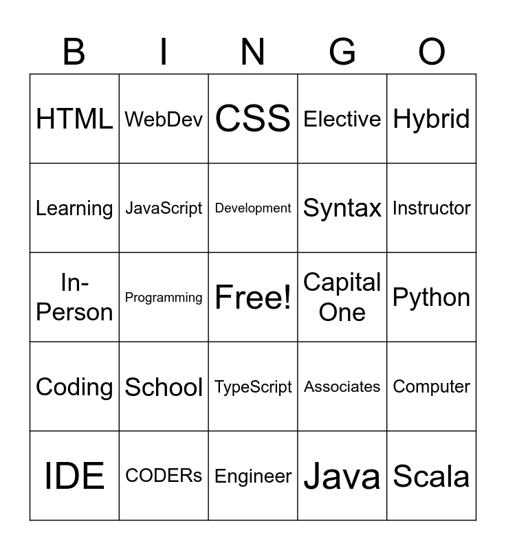 This bingo card has a free space and 30 words: CODERs, Volunteer, Programming, C++, HTML, CSS, JavaScript, TypeScript, Capital One, Engineer, Python, Scala, Java, Mentor, Instructor, Conference, Associates, Coding, School, Hybrid, In-Person, Teacher, WebDev, Syntax, Learning, Elective, Computer, IDE, Development and Testing.