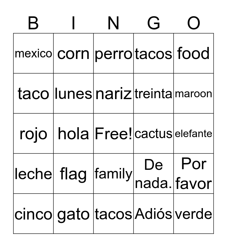 This bingo card has a free space and 24 words: flag, gato, nariz, cinco, food, mexico, taco, corn, cactus, family, treinta, rojo, De nada., Por favor, lunes, Adiós, elefante, perro, maroon, hola, verde, leche, tacos and tacos.