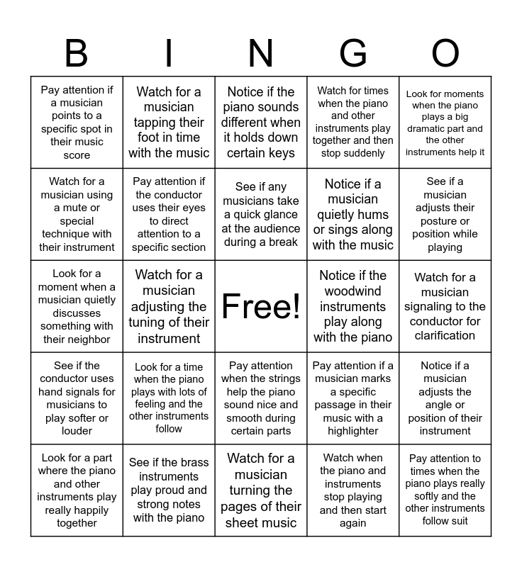 This bingo card has a free space and 45 words: Watch for a moment when only the piano is playing and then see if the other instruments join in, Pay attention to times when the piano plays really softly and the other instruments follow suit, Notice when the conductor helps the piano and instruments play together perfectly, Look for a part where the piano and other instruments play really happily together, See if the piano and other instruments play at different speeds, Watch when the piano and instruments stop playing and then start again, Notice if the piano sounds different when it holds down certain keys, Pay attention when the piano plays a fancy run of notes and the other instruments support it, Look for moments when the piano plays a big dramatic part and the other instruments help it, See if the brass instruments play proud and strong notes with the piano, Watch for times when the piano and other instruments play together and then stop suddenly, Notice if the woodwind instruments play along with the piano, Pay attention when the strings help the piano sound nice and smooth during certain parts, Look for a time when the piano plays with lots of feeling and the other instruments follow, See if the percussion instruments add exciting beats to the piano's music, Watch for a musician turning the pages of their sheet music, Notice if any musician has a pencil behind their ear or in their hand, Look for a moment when a musician quietly discusses something with their neighbor, Pay attention if the conductor uses expressive facial expressions to convey a mood, See if a musician adjusts their posture or position while playing, Watch for a musician tapping their foot in time with the music, Notice if the conductor uses their hands to shape the sound of the orchestra, Look for a moment when a musician adjusts the height of their music stand, Pay attention if a musician points to a specific spot in their music score, See if any musicians exchange a quick glance or nod during a challenging section, Watch for a musician signaling to the conductor for clarification, Notice if the conductor provides encouragement or compliments to the musicians, Look for a moment when a musician shares a supportive gesture with a fellow musician, Pay attention if a musician marks a specific passage in their music with a highlighter, See if the conductor uses hand signals for musicians to play softer or louder, Watch for a musician mouthing the notes or singing along quietly, Notice if a musician adjusts the angle or position of their instrument, Look for a moment when a musician nods in agreement with the conductor's feedback, Pay attention if the conductor points to a specific section for emphasis, See if any musicians use non-verbal communication to convey a message, Watch for a musician adjusting the tuning of their instrument, Notice if a musician shares a quick smile with the conductor or other musicians, Look for a moment when a musician demonstrates a finger position or technique to others, Pay attention if the conductor uses a baton or gestures with their hands directly, See if any musicians take a quick glance at the audience during a break, Watch for a musician using a mute or special technique with their instrument, Notice if a musician quietly hums or sings along with the music, Look for a moment when a musician gestures to indicate a change in tempo, Pay attention if the conductor uses their eyes to direct attention to a specific section and See if any musicians shake hands or exchange a fist bump at the end of the rehearsal.
