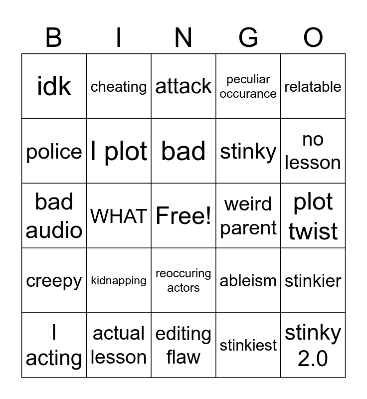 This bingo card has a free space and 24 words: kidnapping, actual lesson, bad, l acting, relatable, idk, police, cheating, weird parent, reoccuring actors, stinky, bad audio, ableism, stinkier, l plot, stinkiest, plot twist, attack, no lesson, WHAT, stinky 2.0, creepy, peculiar occurance and editing flaw.