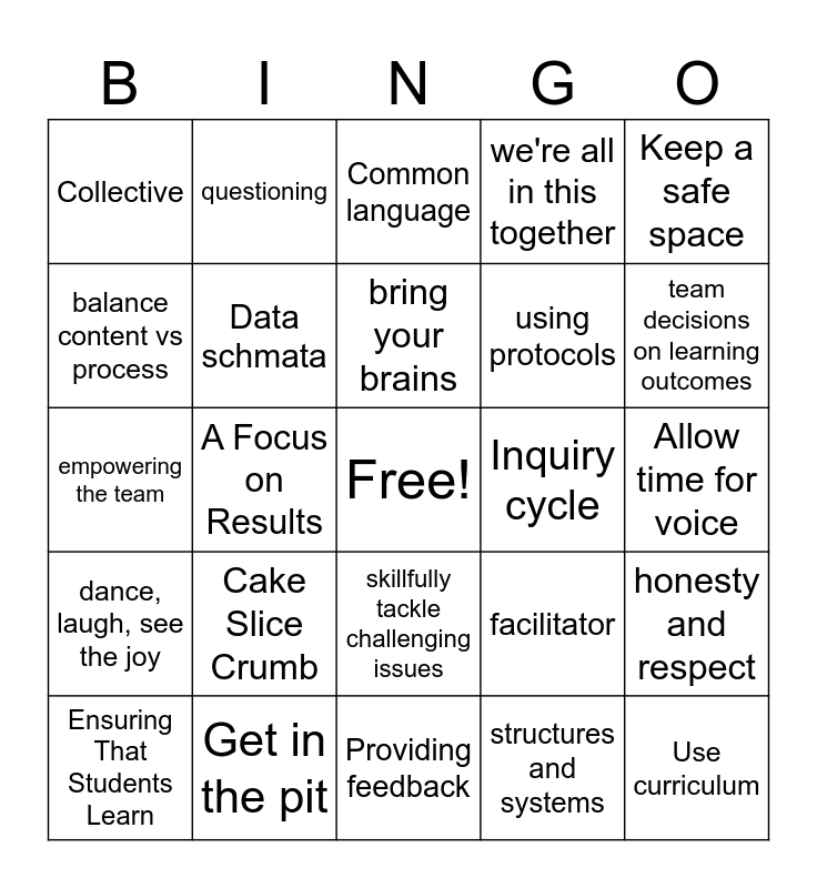 This bingo card has a free space and 29 words: Ensuring That Students Learn, A Culture of Collaboration, A Focus on Results, Hard Work and Commitment, Collective, Common language, Data schmata, Cake Slice Crumb, Inquiry cycle, Get in the pit, Allow time for voice, Use curriculum, Providing feedback, structures and systems, team decisions on learning outcomes, shared purpose, skillfully tackle challenging issues, dance, laugh, see the joy, Keep a safe space, empowering the team, facilitator, meeting norms, using protocols, balance content vs process, we're all in this together, questioning, honesty and respect, bring your brains and do what you say you're going to do.