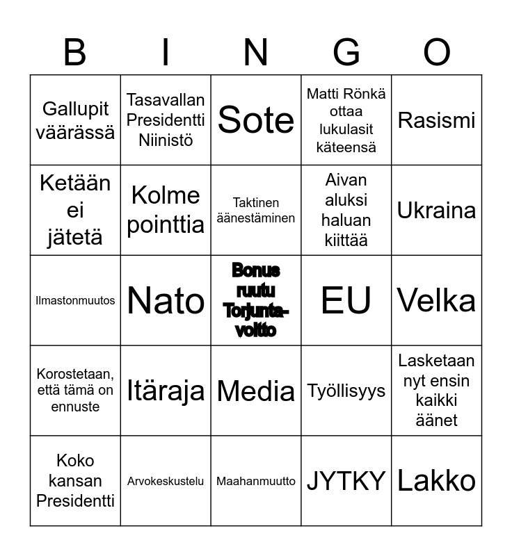 This bingo card has a free space and 24 words: Itäraja, Arvokeskustelu, Taktinen äänestäminen, Koko kansan Presidentti, Rasismi, Gallupit väärässä, Ketään ei jätetä, Tasavallan Presidentti Niinistö, EU, Media, Aivan aluksi haluan kiittää, Ilmastonmuutos, Työllisyys, Lasketaan nyt ensin kaikki äänet, Kolme pointtia, JYTKY, Velka, Sote, Ukraina, Nato, Lakko, Korostetaan, että tämä on ennuste, Matti Rönkä ottaa lukulasit käteensä and Maahanmuutto.