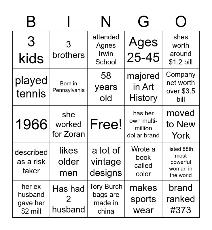 This bingo card has a free space and 24 words: likes older men, Has had 2 husband, 58 years old, her ex husband gave her $2 mill, shes worth around $1.2 bill, 3 kids, played tennis, 3 brothers, has her own multi-million dollar brand, a lot of vintage designs, majored in Art History, 1966, Wrote a book called color, listed 88th most powerful woman in the world, Born in Pennsylvania, makes sports wear, moved to New York, attended Agnes Irwin School, Company net worth over $3.5 bill, she worked for Zoran, brand ranked #373, described as a risk taker, Ages 25-45 and Tory Burch bags are made in china.