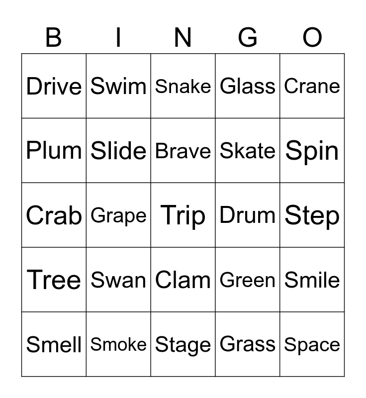 This bingo card has 35 words: Block, Flag, Sled, Slide, Clam, Glass, Plum, Glove, Brave, Bride, Crab, Crane, Price, Prince, Drive, Drum, Grass, Grape, Tree, Trip, Green, Smell, Smile, Smoke, Snake, Spin, Space, Ski, Skate, Step, Stop, Stage, Swan, Swim and Sweep.