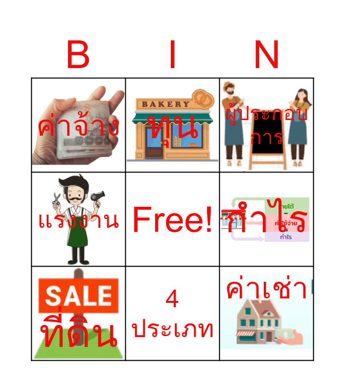 This bingo card has 8 images, a free space and 9 words: ที่ดิน, ผู้ประกอบการ, ทุน, แรงงาน, ค่าจ้าง, กำไร, ค่าเช่า, ดอกเบี้ย and 4 ประเภท.