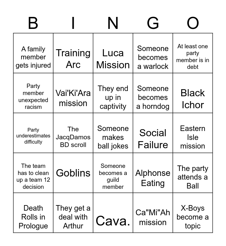 This bingo card has a free space and 24 words: Goblins, They get a deal with Arthur, They end up in captivity, Death Rolls in Prologue, At least one party member is in debt, A family member gets injured, Party member unexpected racism, Training Arc, Social Failure, Someone becomes a guild member, Someone becomes a horndog, Party underestimates difficulty, Alphonse Eating, The party attends a Ball, Vai'Ki'Ara mission, Ca"Mi"Ah mission, Eastern Isle mission, Luca Mission, Black Ichor, The JacqDamos BD scroll, X-Boys become a topic, The team has to clean up a team 12 decision, Someone becomes a warlock and Cava..