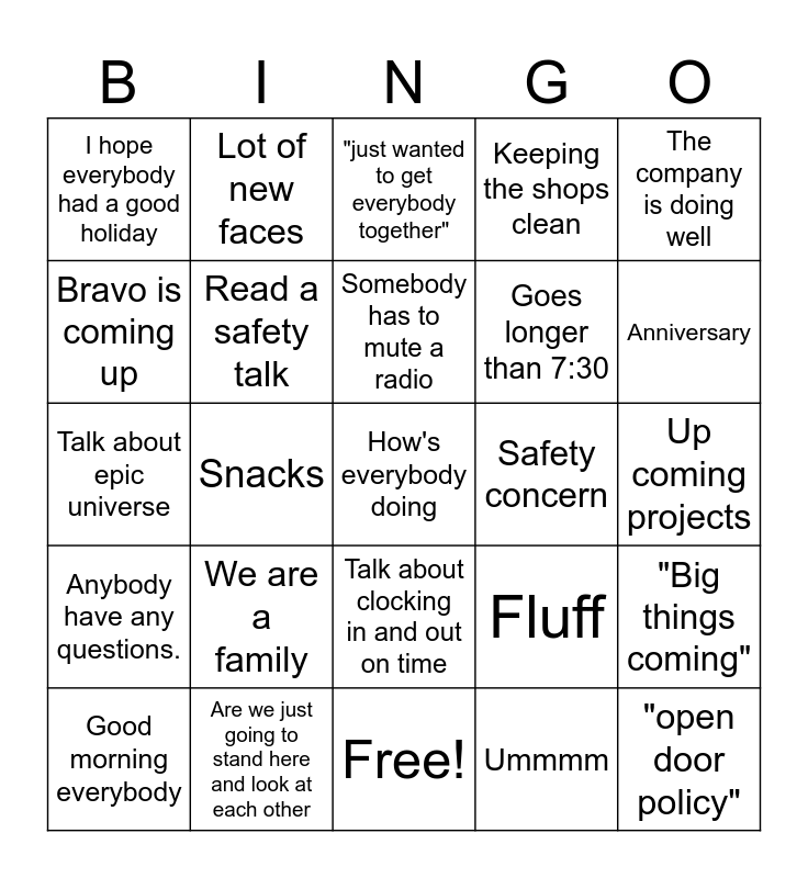 This bingo card has 25 words: Anybody have any questions., Are we just going to stand here and look at each other, How's everybody doing, Ummmm, The company is doing well, I hope everybody had a good holiday, Lot of new faces, "just wanted to get everybody together", Safety concern, "Big things coming", Bravo is coming up, Read a safety talk, Free!, Fluff, Anniversary, Good morning everybody, Snacks, Somebody has to mute a radio, Goes longer than 7:30, Up coming projects, Talk about epic universe, We are a family, Talk about clocking in and out on time, Keeping the shops clean and "open door policy".